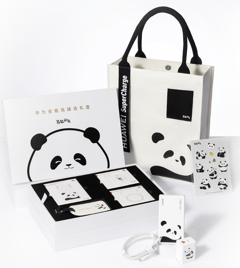 该礼盒内含华为自带线万能充迁徙电源 (100W 12000) 熊猫和花主题截止版、华为万能充多口充电器 (Max 100W) 熊猫和花主题截止版、华为编织数据线 (Max 120W) 熊猫和花主题截止版,另外含补救帆布包、行李牌、贴纸等。